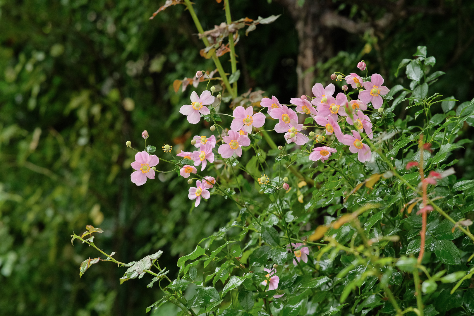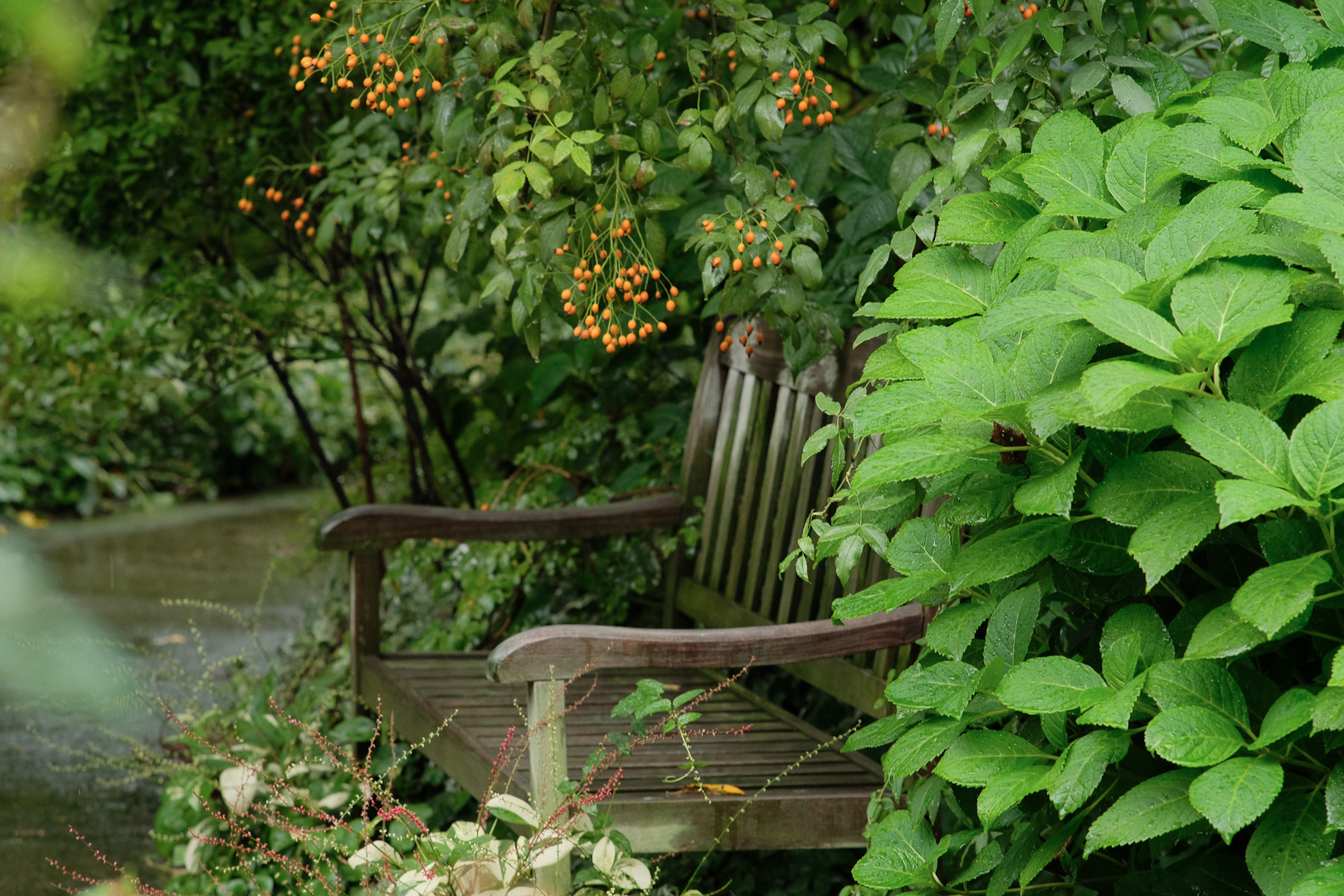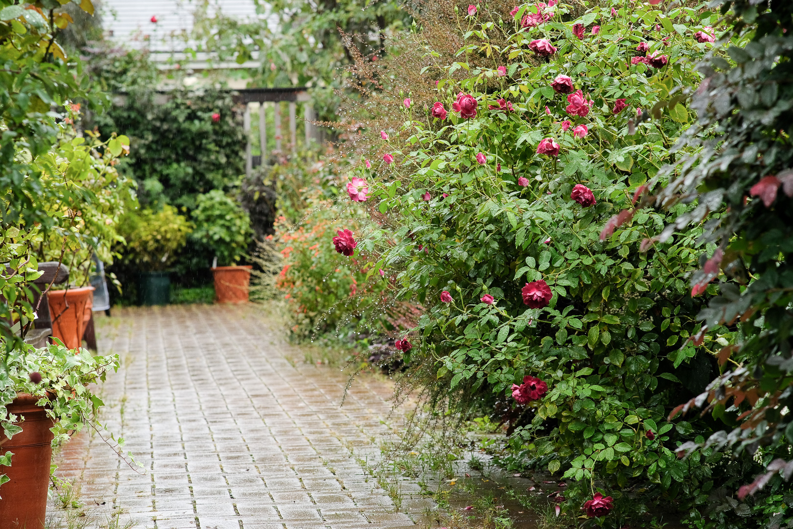 今回、一番気に入った風景は、ローズヒップに囲まれたベンチでした。写真では小さくて分からないけれど、オレンジ色のローズヒップが鈴なりになっているのを初めて見ました。