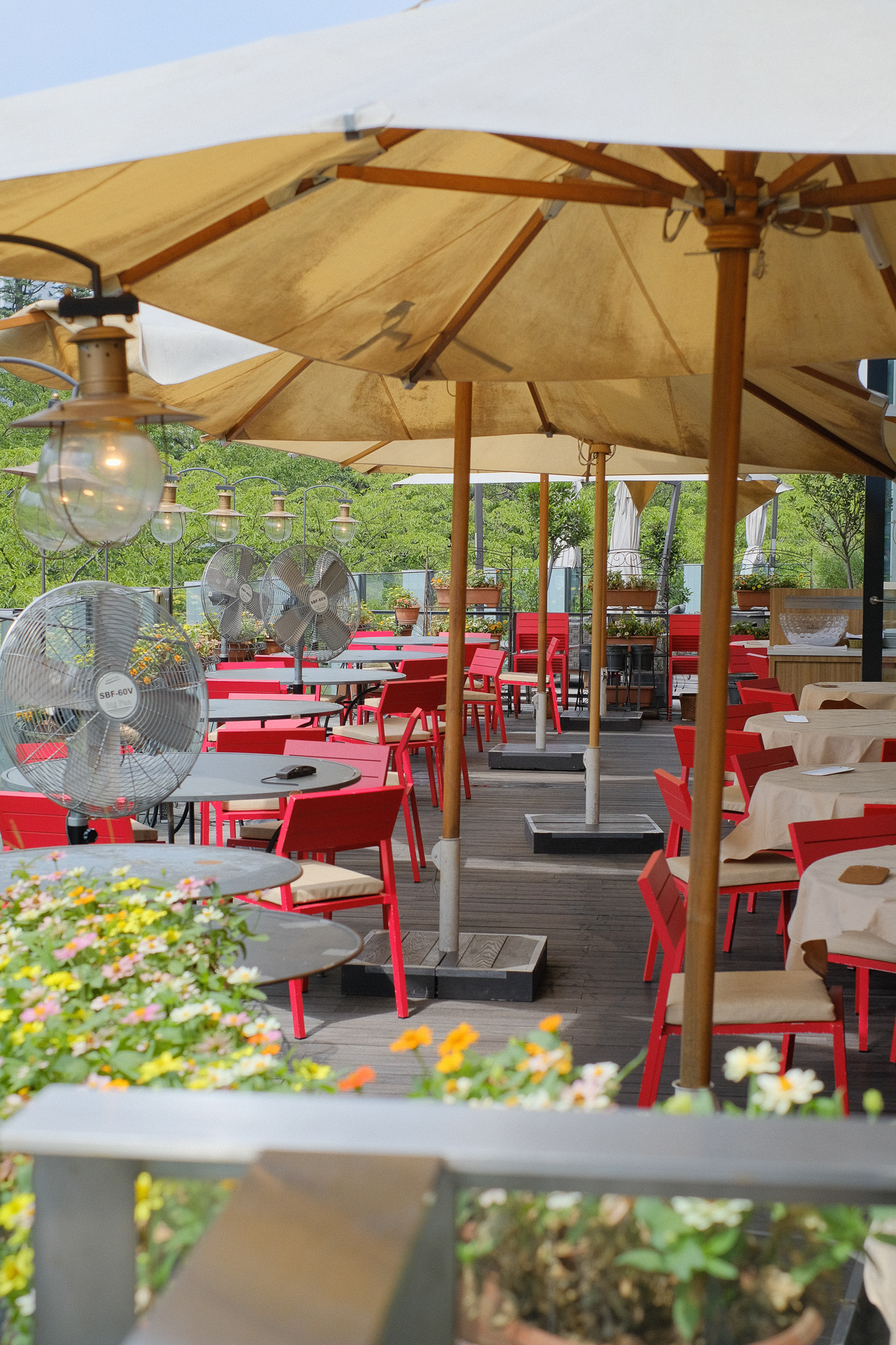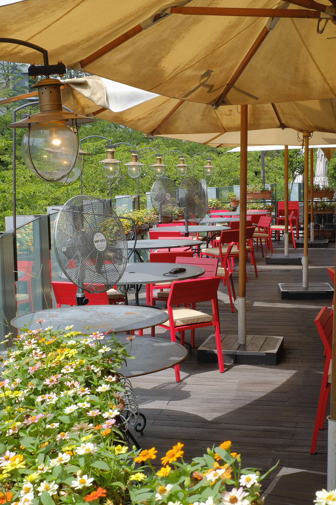 東京ミッドタウンのレストランのアウトドア席を撮ったもの。最初の一枚目が以下。写真下にアルミの手すりを入れて奥行きを出そうとした。不満だったのは、