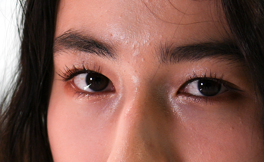 意地悪をして、85mm f.16で被写界深度が非常に薄い設定で試しました。それでも、等倍で確認すると瞳にしっかりピントが合っています。(モデルさんの左目にピントが合い、被写界深度が薄いので右目は少しボケています)