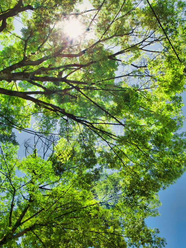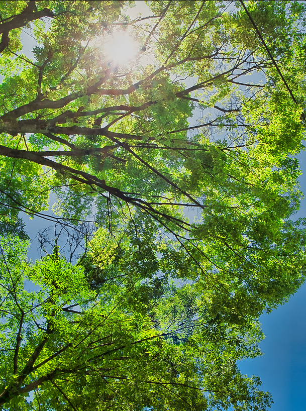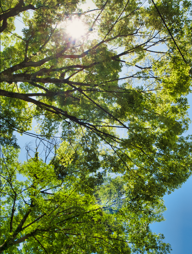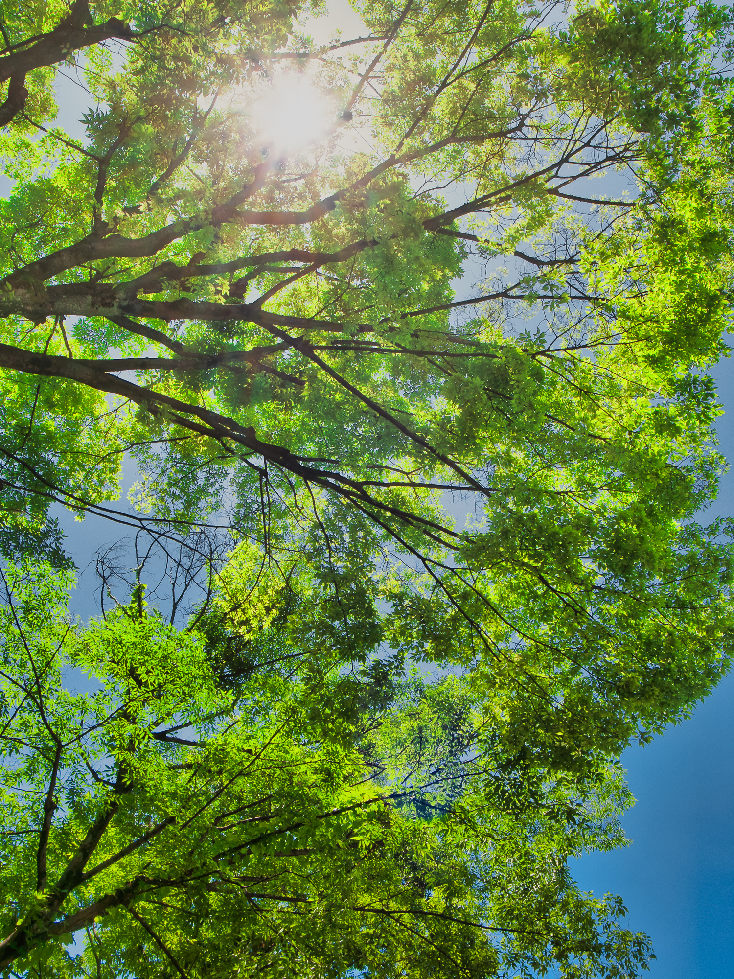 陽射しが強い日に上を見上げると大きな木が枝を伸ばして綺麗に見えた。その時感じた、眩しい印象を写真に撮りました。